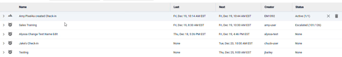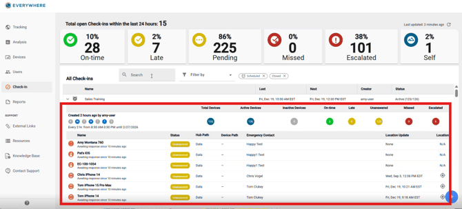 The Check-in Dashboard is a page in the Everywhere Hub that helps you monitor scheduled and self check-ins for your team. It gives you a quick view of who has responded, who is late, and who needs attention. This dashboard is designed for real-time operational awareness, not long-term reporting.