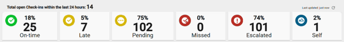 Along the top of the dashboard, you’ll see six tiles that summarize your check-ins by status for the last 24 hours. Each tile shows the current count for that status. Closed check-ins are excluded from these totals.